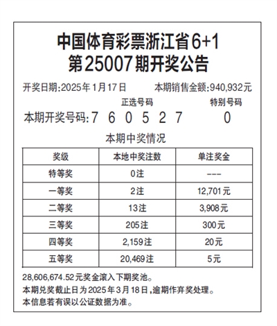 中国体育彩票浙江省6+1 第25007期开奖公告