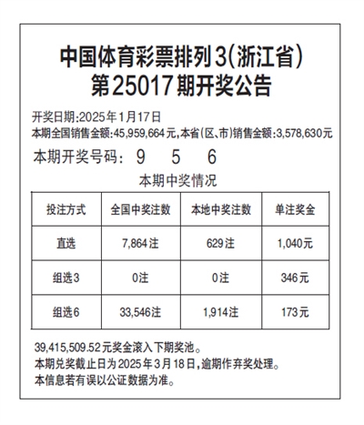 中国体育彩票排列3(浙江省) 第25017期开奖公告