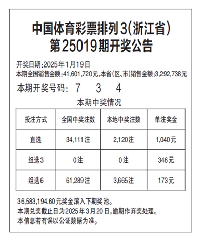 中国体育彩票排列3(浙江省) 第25019期开奖公告