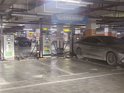 昨天上午,橙柿直通车来到萧山体育中心负一楼,充电桩停车位停着几辆新能源车,但都没有在充电。充电桩显示的运营商是“牛充饱无人休闲驿站”。