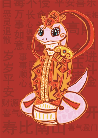 这对“蛇”门神里加上传统中国元素,再把蛇的形象可爱化,让人们能够把蛇的样子从令人生畏变为亲切可人。蛇抱着一个如意,也有事事如意的意思。除此之外,王赓还巧妙地植入了都市快报专属的“K”元素,你发现了吗?