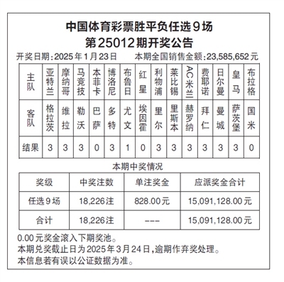 中国体育彩票胜平负任选9场 第25012期开奖公告