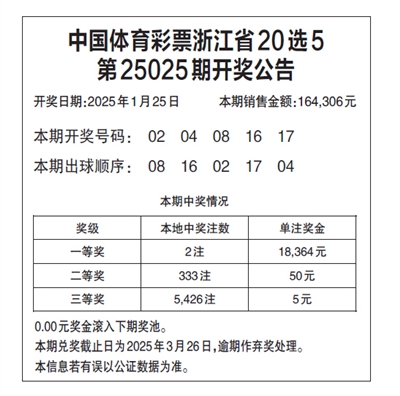 中国体育彩票浙江省20选5 第25025期开奖公告