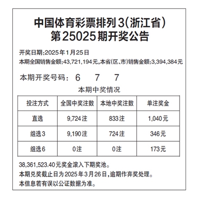 中国体育彩票排列3(浙江省) 第25025期开奖公告