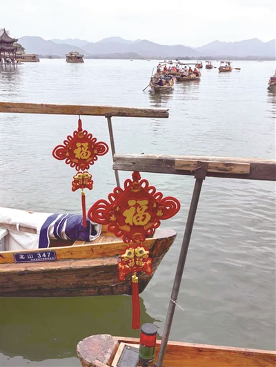 橙友“西湖边儿荡荡”:出来走走,西湖边手划船都挂上了中国结,喜气洋洋。