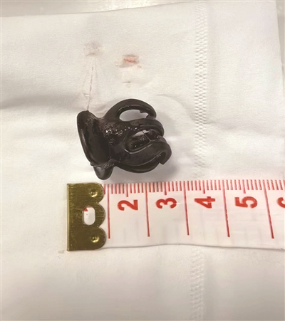 耳鼻喉科虞璐璐医师接到召唤后,火速赶到现场。凭借多年积累的经验,虞医师迅速规划出一套救援策略。在急诊团队的默契配合下,虞医师左手稳稳持着压舌板,右手紧握枪状镊,小心翼翼地展开救援。她的眼神在贝贝的面庞与手中的器械间来回穿梭,不断调整着最佳的角度与深度。