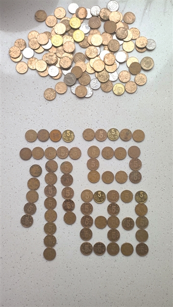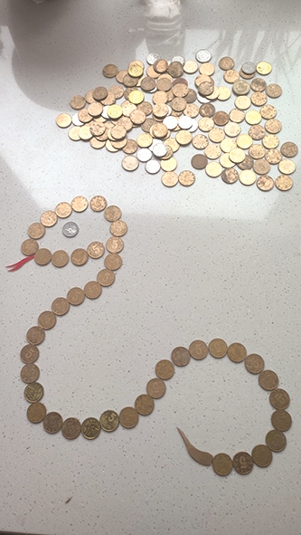 用不同年份的五角硬币 组成了一条灵蛇和福字