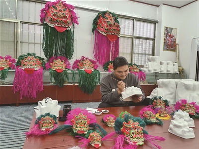“现在出去参展,客商对产品非常满意,但问到价格却退却了,因为一个大狮子头要卖5000元,小狮子头要卖400元左右。纸塑狮子头全部是手工,机器没法代替,一个大狮子头要粘上12层牛皮纸,经过至少20道工序,全部完工至少得12天,小狮子头也得一周左右,时间就是最大的成本。”