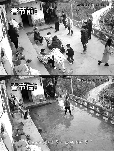 重庆网友@麻辣周周 将老家院子里摄像头拍下的年初二、初三的视频放在一起作对比:大年初二天气晴朗,家中的男女老少都聚在院子里晒太阳、聊天;大年初三天空下起了略带孤独的小雨,老人独自站在屋檐下望着家门口的路,身边只有两只狗陪着。