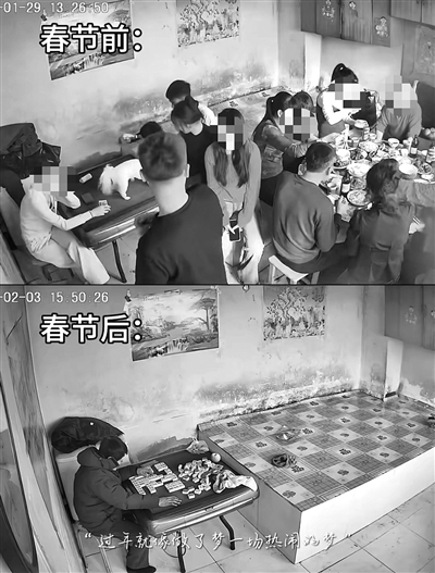 内蒙古的网友@MIN_ 记录的则是老家房间内监控摄像头下的场景:除夕中午,大家围坐一桌吃着团圆饭,有说有笑;过完年后,老人独自坐在麻将桌边摆麻将牌玩,仿佛在回味热闹的那几天。