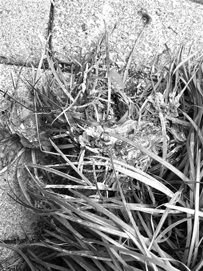 昨天下午,橙柿直通车来到橙友所说的路口,小红车服务点旁的一个树池一角,确实有一团新的水泥,把一团草的尖端都纠缠在了一起,轻轻扒拉一下,草上的水泥就连着小草,松松垮垮被拨到了一旁。
