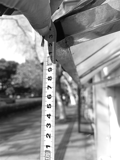 雨篷向延安路人行道方向伸出,人行道另一侧是梧桐树,如果两人并肩走过这里,靠墙一侧的人会走在雨篷下方。记者测量了一下,雨篷伸出的距离有64厘米,距离地面的高度约1.82米。