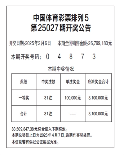 中国体育彩票排列5 第25027期开奖公告