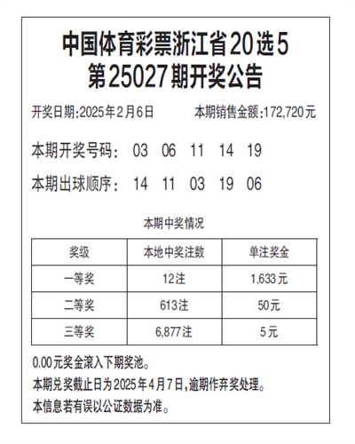 中国体育彩票浙江省20选5 第25027期开奖公告
