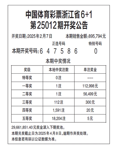 中国体育彩票浙江省6+1 第25012期开奖公告