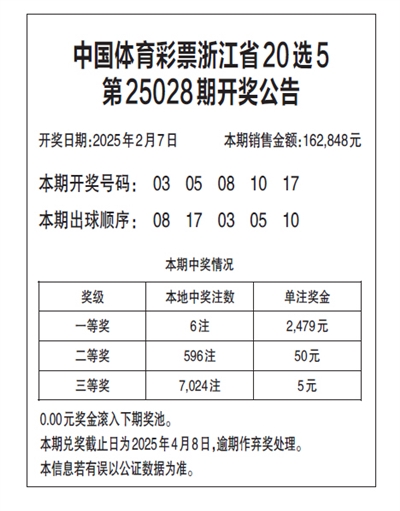 中国体育彩票浙江省20选5 第25028期开奖公告