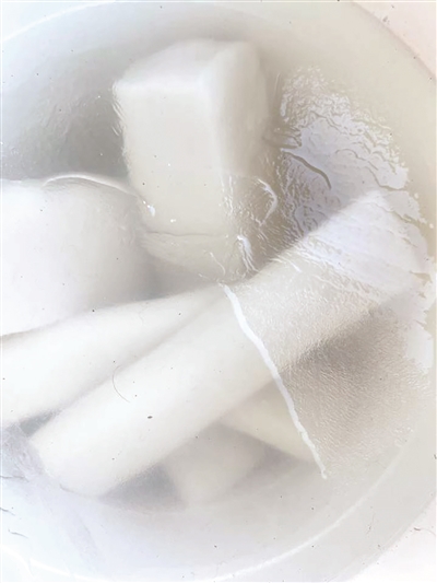 不开玩笑,昨天可能还真是冰箱更暖和点。橙友“西湖之牛”发帖说,自己早上本来想拿年糕烧早餐,结果发现窗外浸放年糕的水盆里结了厚厚的冰,约莫有2厘米厚。另一位橙友“林月如”也爆料说,家里的年糕结冰了,“这个温度真的很到位呀!”
