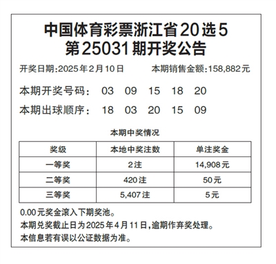 中国体育彩票浙江省20选5 第25031期开奖公告