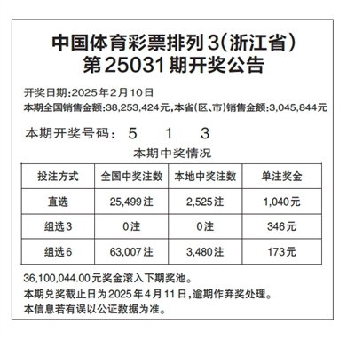 中国体育彩票排列3(浙江省) 第25031期开奖公告