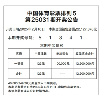 中国体育彩票排列5 第25031期开奖公告