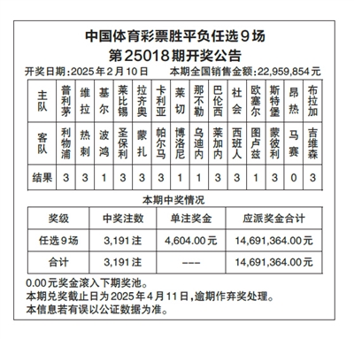 中国体育彩票胜平负任选9场 第25018期开奖公告