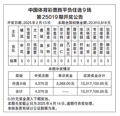 中国体育彩票胜平负任选9场 第25019期开奖公告