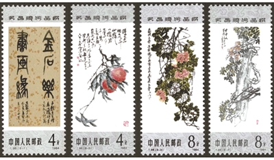条屏式的邮票,属于收藏界的“老、精、稀”。这次邮册中收录了2枚条屏式邮票,分别来自:1980年,中国邮政发行的《齐白石作品选》特种邮票;1984年,中国邮政发行的《吴昌硕作品选》特种邮票。