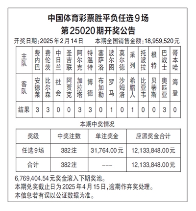 中国体育彩票胜平负任选9场 第25020期开奖公告