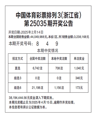中国体育彩票排列3(浙江省) 第25035期开奖公告