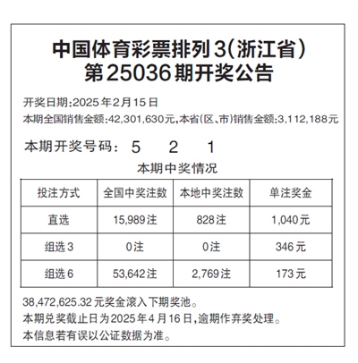 中国体育彩票排列3(浙江省) 第25036期开奖公告