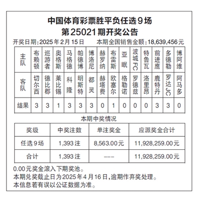 中国体育彩票胜平负任选9场 第25021期开奖公告