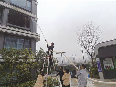 11点50分起火业主家的窗台出现了冒烟复燃的情况,物业的保安李队长带领工作人员打开了楼下的消火栓进行了二次灭火,之后李队长安排了工作人员盯牢现场,防止再度复燃。