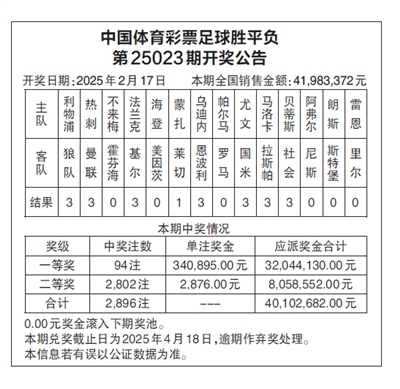 中国体育彩票足球胜平负 第25023期开奖公告