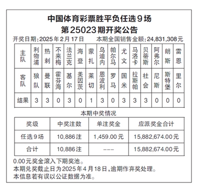 中国体育彩票胜平负任选9场 第25023期开奖公告