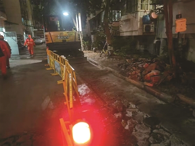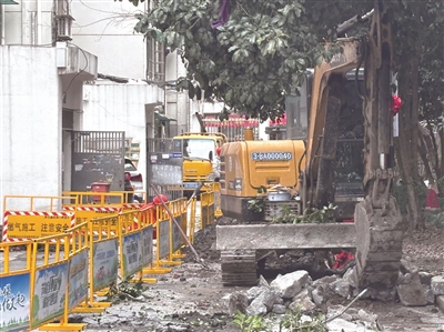 接到反映后,橙柿直通车记者来到竹竿巷小区的施工现场,施工现场的两端已经设置了亮黄色的围栏,栏杆内有一辆挖掘机正在作业,清理路面上破碎的水泥块。