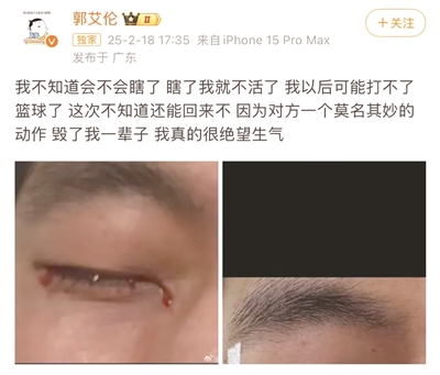 2月18日下午,中国职业篮球运动员郭艾伦在社交网络上发了眼睛流血的照片,透露自己在训练中眼睛遭受重伤。“郭艾伦眼睛流血”迅速冲上热搜榜第一。