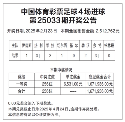 中国体育彩票足球4场进球 第25033期开奖公告