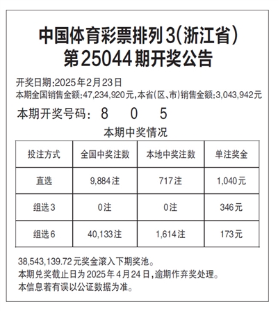 中国体育彩票排列3(浙江省) 第25044期开奖公告