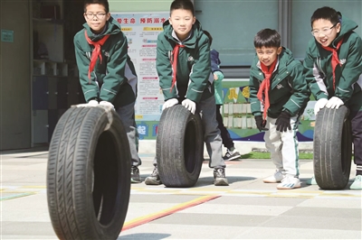 下课铃一响,只见十几个男生迅速走出教室,摆弄起这些轮胎,在老师的引导下,几个男生开始在赛道上用手推起了轮胎,比拼起速度和力量,跟着走出教室的学生也纷纷前来围观。