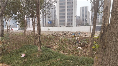 在贴沙河旁,工地挖出的土堆石块与绿化相连,靠近工地的绿化相对有些稀疏。