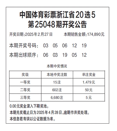 中国体育彩票浙江省20选5 第25048期开奖公告