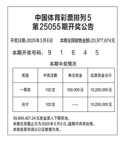 中国体育彩票排列5 第25055期开奖公告