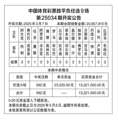 中国体育彩票胜平负任选9场 第25034期开奖公告