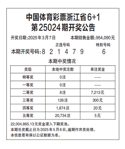 中国体育彩票浙江省6+1 第25024期开奖公告