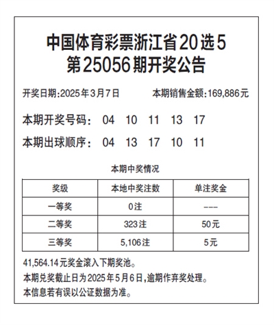 中国体育彩票浙江省20选5 第25056期开奖公告
