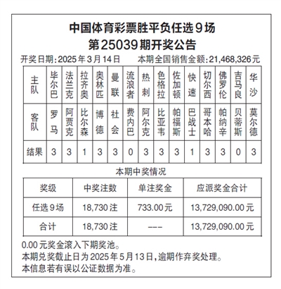 中国体育彩票胜平负任选9场 第25039期开奖公告