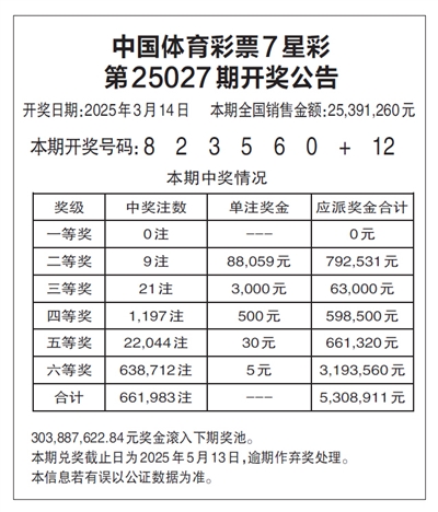 中国体育彩票7星彩 第25027期开奖公告