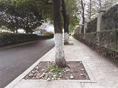 杭州市园林风景协会的秘书长钱小平表示,行道树树池的材料没有特别的要求,只要不影响树木生长,不影响树根部的透气排水就可以。目前树池铺设的材料采用的有鹅卵石,碎石、陶粒、植物鳞片、复合材料板及钢质或铝质网格板等,像新风路人行道这些树池,因为有鹅卵石容易被脚踢(因路比较窄),可以改用复合材料的网格板或是固定,这样不影响行走。