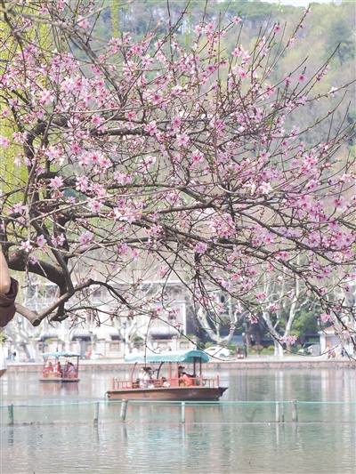昨天的西湖,阳光明媚,游船从桃花下驶过。 橙友“西湖原住民” 摄