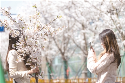 古莲街,女孩拿着园林工人修剪下来的樱花枝条拍照。记者 夏阳 摄
